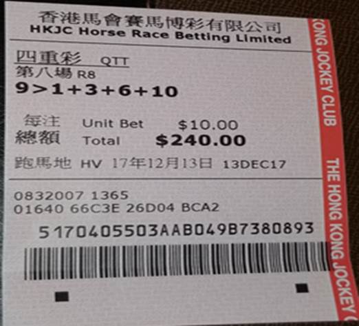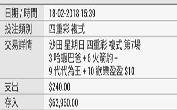 2月18日:用者只投注240元,命中四重彩收6萬2千元 ($62,960元)
