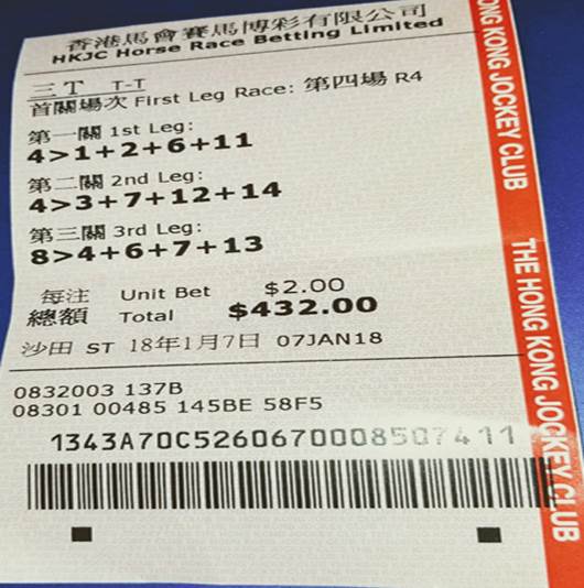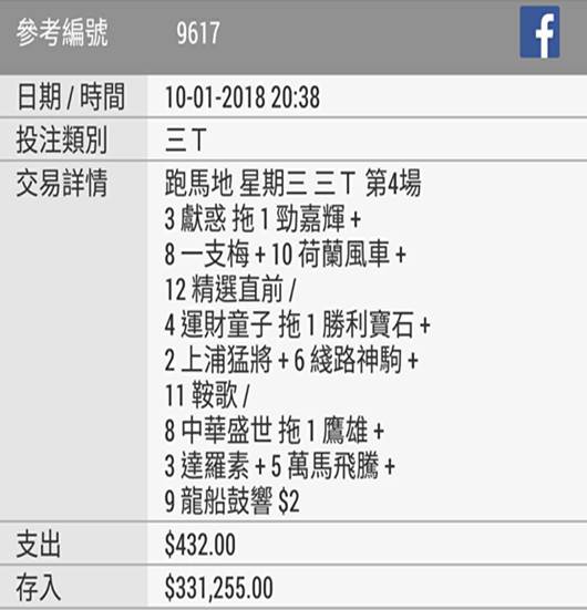 1月11日:用者只投注432元,命中三T收33萬1千元 ($331,255)