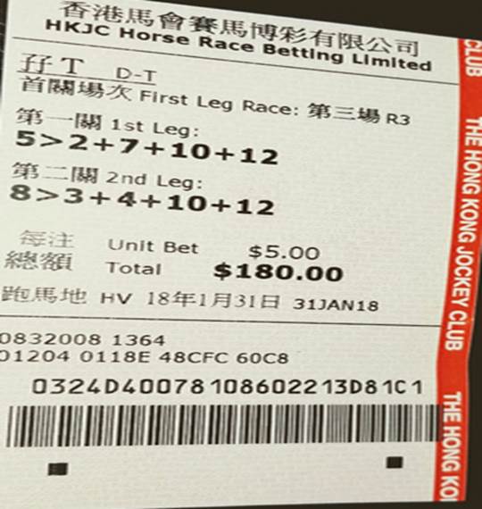 1月31日:用者只投注180元,命中孖T收13萬2千元 ($132,233元)