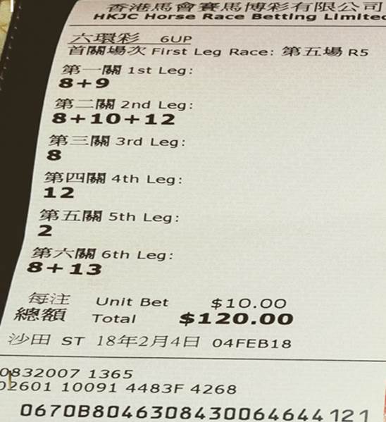 2月4日:用者只投注120元,命中六環彩收10萬5千元 ($105,285元)