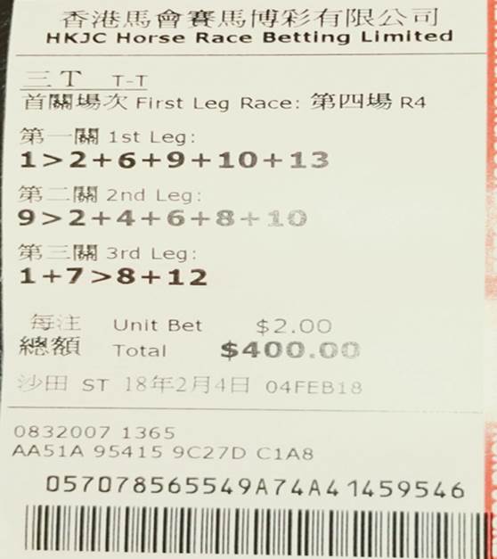2月4日:用者只投注400元,命中三T收2百77萬3千元 ($2,773,454元)