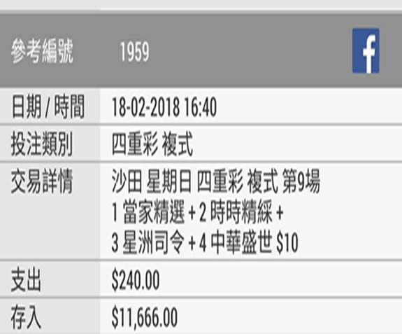 2月18日:用者只投注240元,命中四重彩收1萬1千元 ($11,666元)