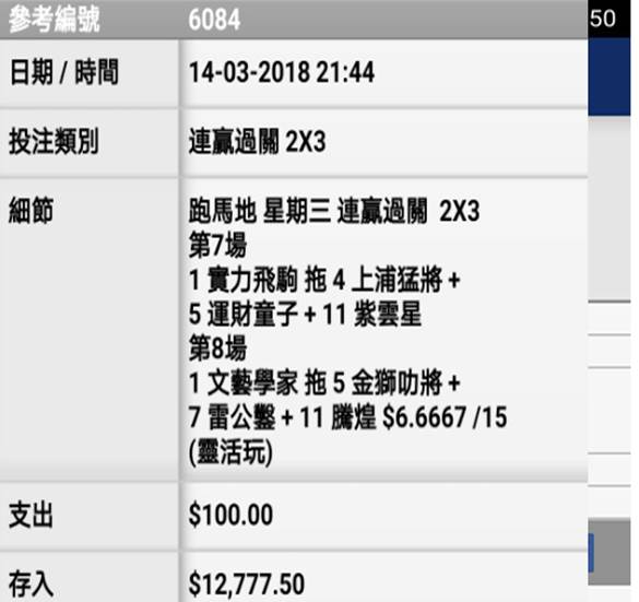 3月14日:用者只投注100元,命中連贏過關收1萬2千元 ($12,777元)
