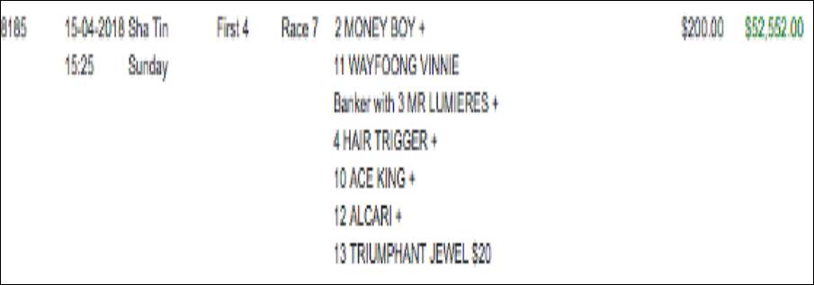 4月15日:用者只投注200元,命中四連環收5萬2千元 ($52,552元)